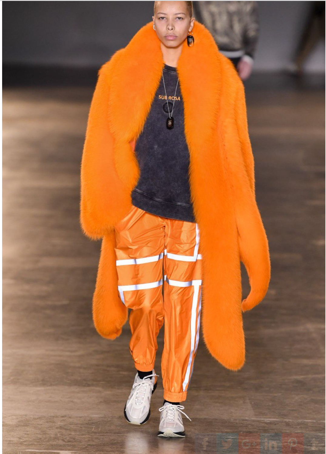 La pelliccia era presente in collezione con maglioni full fur, cappucci e cappotti lunghi capaci di aggiungere un'altra dimensione all'abbigliamento da lavoro di Abloh e rendendolo divertente. Due le pellicce erano sorprendenti, entrambe simili nello stile, grandi, gonfie e sontuose, epiche e capaci di catturare l’attenzione. Colori: nero, bianco, grigio e blu, più un magenta colorava cappelli, pantaloni, guanti, cinturini delle scarpe, cappotti e maglioni.