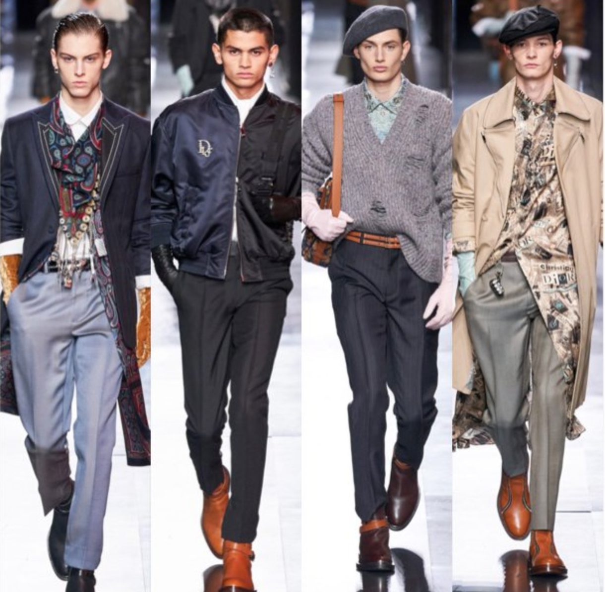 Dior è entrato nel nuovo decennio con una collezione di abbigliamento maschile senza tempo e contemporaneamente spavalda. Colori: neri, grigi, beige. Prevalenti in collezione i blazer e i trench abbinati a camicie e maglioni e ai pantaloni, alcuni rimboccati alla caviglia, altri no.