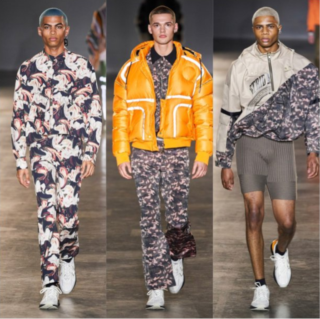 Camicie e pantaloni multicolori con "stampe tratte dal mondo dell'artista Erik Jones" - WWD, riprodotte ovunque. Il punto forte della collezione di Crutchley erano le pellicce: cappotti voluminosi, lunghi e oversize. Colori ridotti al minimo: nero, bianco rigato di nero e motivi militari nei toni del marrone.